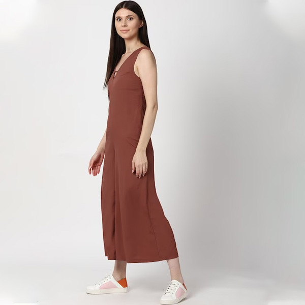 Brown solid basic jumpsuit ,has a v-neck, sleevelessSize & FitThe model (height 5'8) is wearing a size SMaterial & CarePolyesterMachine wash