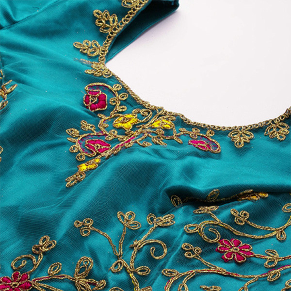 Embroidered unstitched blouse, has a round neck, short sleeves, pink and blue embroidered unstitched lehenga, flared hem