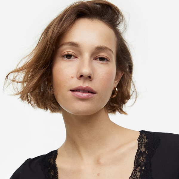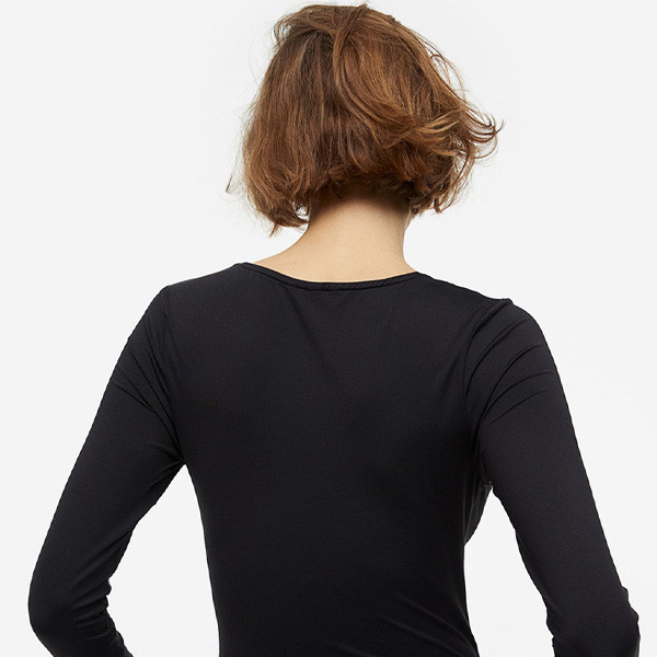 Body in soft jersey with a deep, trimmed, V-shaped opening at the front, long sleeves and concealed press-studs at the crotch.