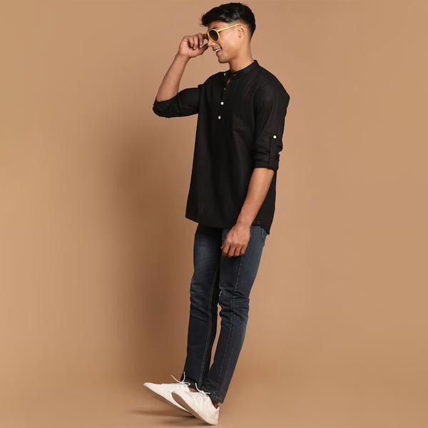 Colour: black Solid Mandarin collar Long, roll-up sleeves Straight shape with regular style Above knee with curved hem Machine weave regular cotton Size & Fit The model (height 6') is wearing a size M Material & Care Cotton Dry Clean