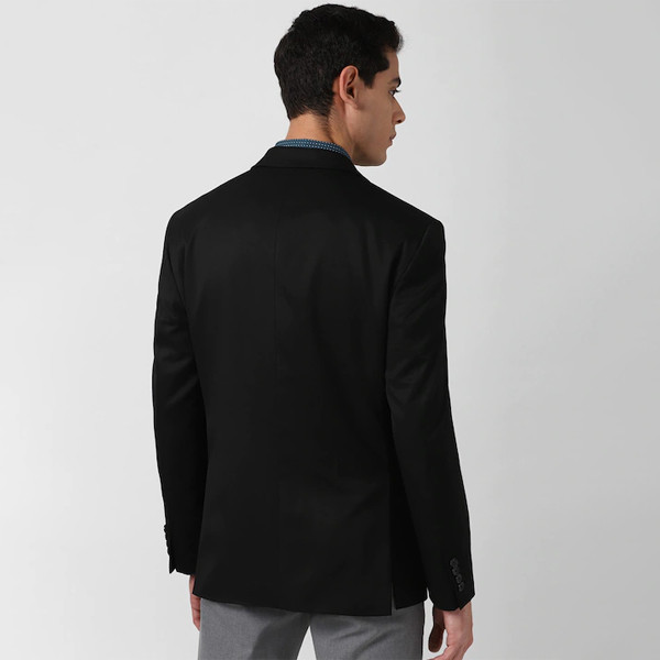 Black solid slim-fit single breasted blazer, has notched lapel collar, long sleeves, a full button placket and three pockets