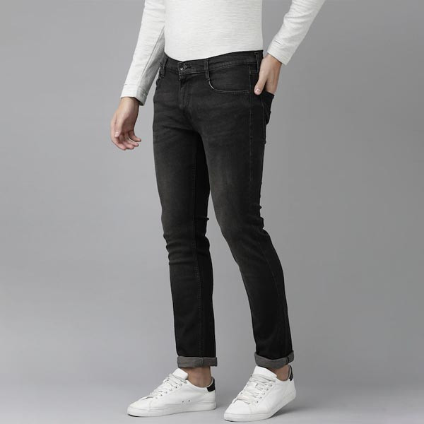 Dark shade, light fade black jeans Slim fit, mid-rise Slim Leg Brand Fit: vapour Clean look Stretchable 5 pockets Has whiskers and chevrons effect Length: regular Size & Fit Brand Fit: Vapour Fit: Slim Fit Stretchable The model (height 6') is wearing a size 32 Material & Care 98% Cotton, 2% Elastane Machine wash, cold