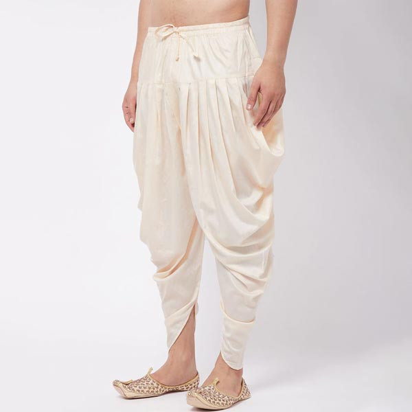 A pair of cream-coloured solid cowl dhoti pants with gathered and pleated detail, has an elasticated waistband, and drawstring closure Size & Fit Regular Fit The model (height 6') is wearing size S Material & Care Satin Blend Dry Clean preferably or cold light wash