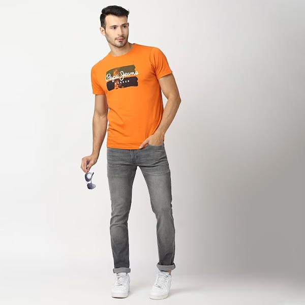 Medium shade, light fade grey jeans Slim fit, mid-rise Brand Fit: Vapour Clean look Stretchable 5 pocket Length: regular Size & Fit Brand Fit: Vapour Fit: Slim Fit Stretchable The model (height 6') is wearing a size 32 Material & Care 98% Cotton & 2% Elastane Machine Wash