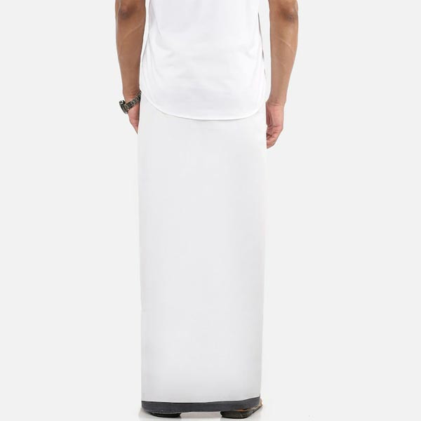 White solid mid-rise dhoti, has black border Size & Fit Dimensions: 3.8 m x 1.25 m(Length x Width) Material & Care 100% Cotton Hand Wash