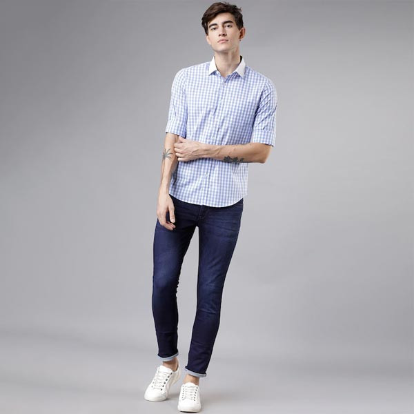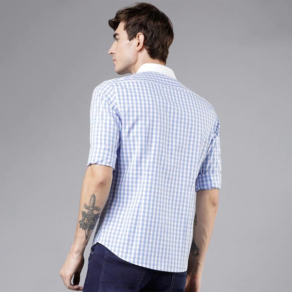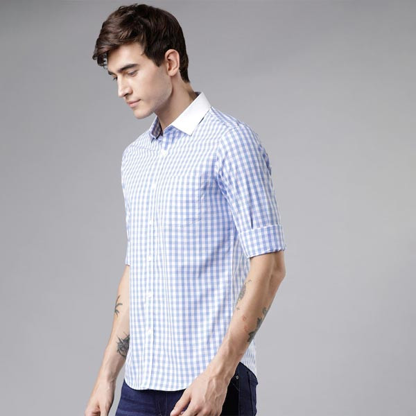 White and blue checked formal shirt, has a spread collar, long sleeves, button placket, curved hem, one patch pocket Size & Fit Slim fit The model (height 6') is wearing a size 40 Material & Care Cotton Machine-wash