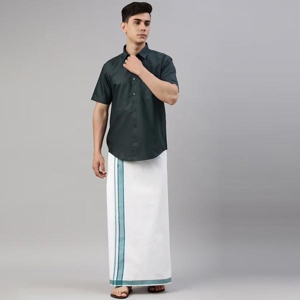 Men White Solid Cotton Dhoti has a green border Material & Care 100% Cotton Machine wash