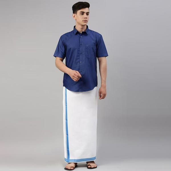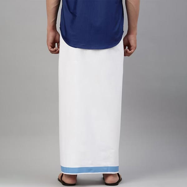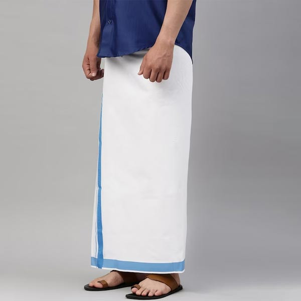 White solid mid-rise dhoti with blue border, secured with a velcro closure, has 1 pocket Size & Fit Onesize Material & Care Cotton Machine wash