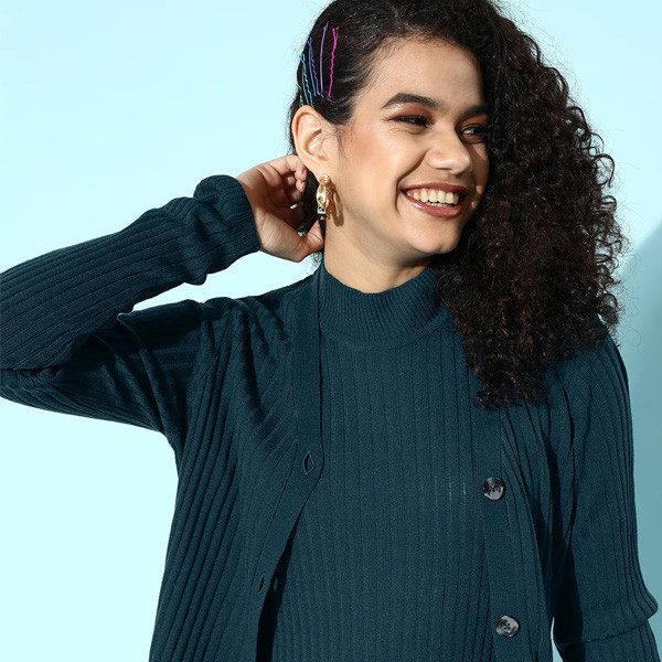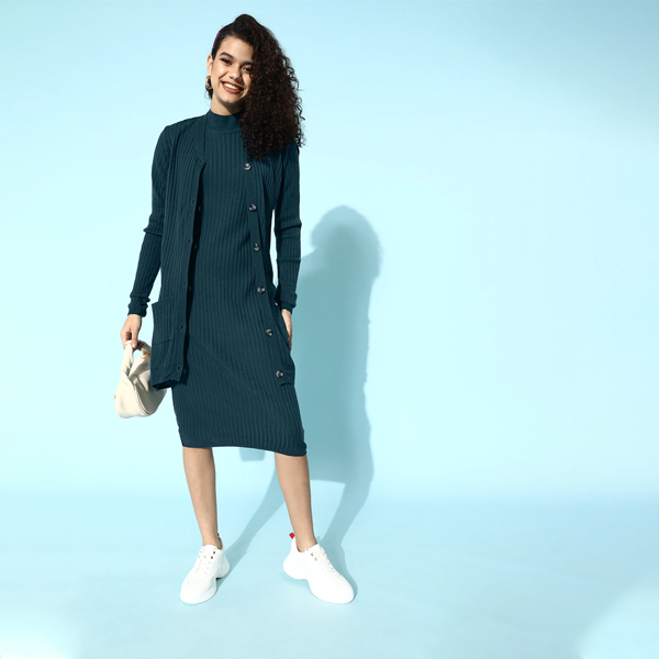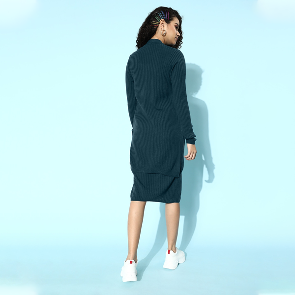Blue solid jumper dressRound neckSleeveless, no sleevesMidi length in straight hemComes with a blazer