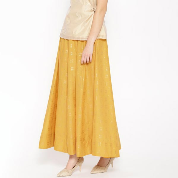 Mustard yellow and golden printed maxi A-line skirt, has an elasticated waistband