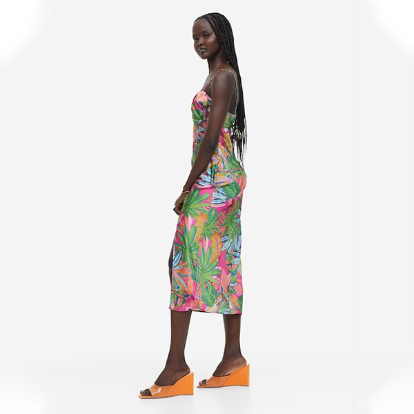 Calf-length, fitted dress in softly draping satin with a luscious, all-over floral print. Square neckline and a gathered seam under the bust creating a ruched effect. Narrow shoulder straps that thread through the sides and tie at the partially open back. Hook-and-eye fastening and a concealed zip at the back. High slit at one side of the front. Lined.
