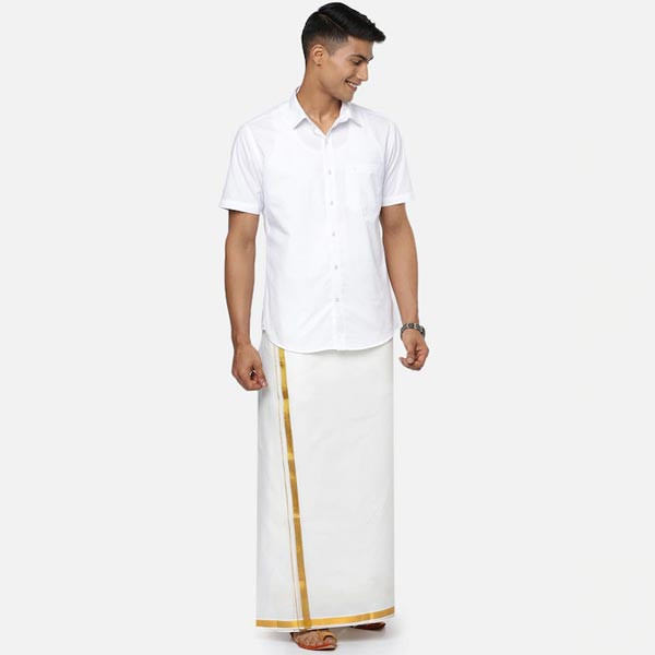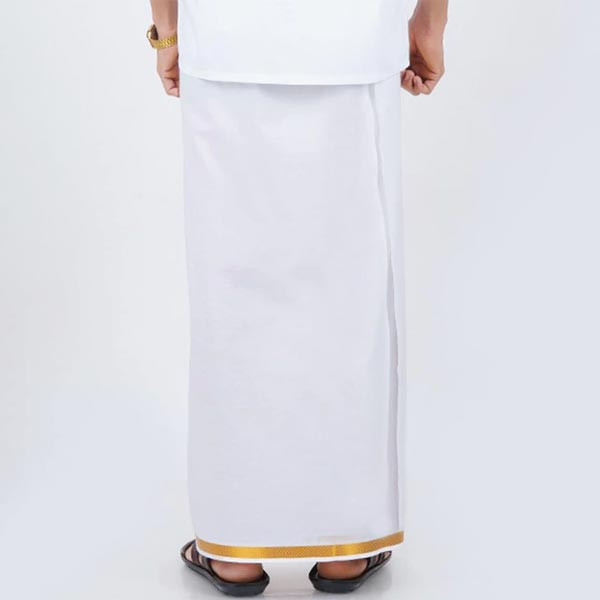 White solid political dhoti has a yellow border Size & Fit The model (height 6') is wearing a size One Size Material & Care 100% Cotton Machine Wash
