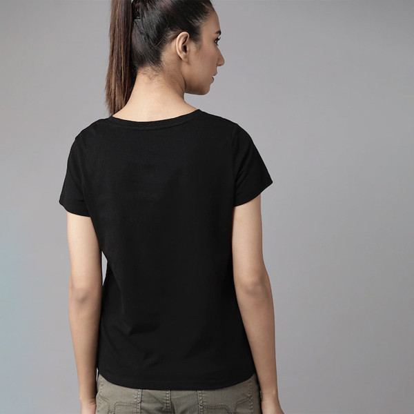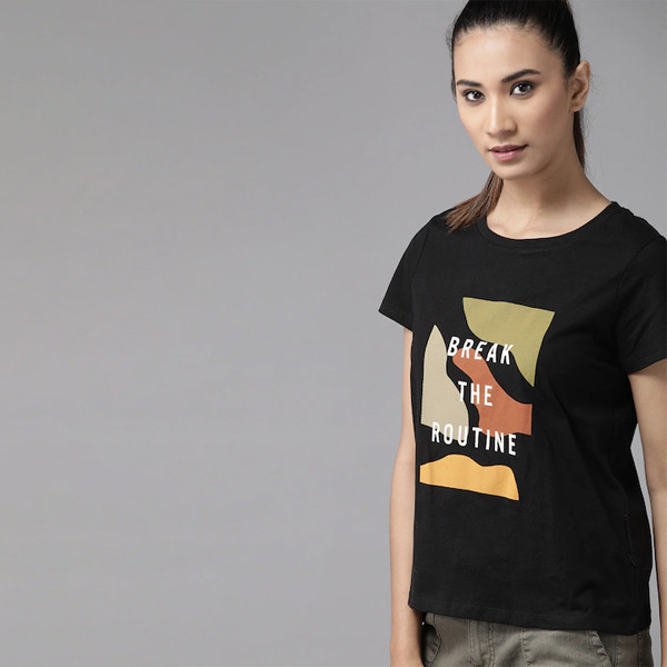 Black and orange printed T-shirt, has a round neck, and short sleeves