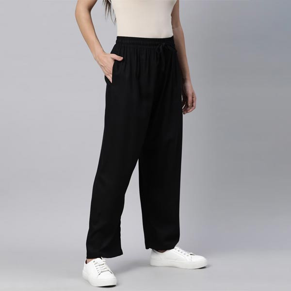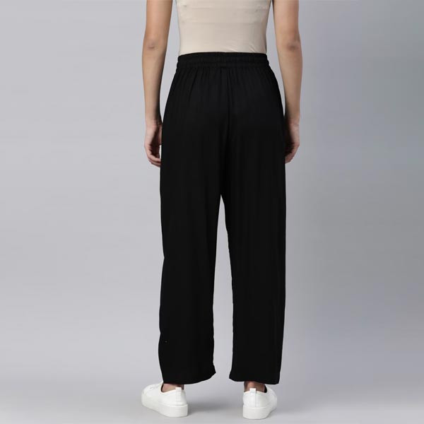 Black Woven palazzos, Solid Opaque and wide leg fit Elasticated waistband, Length : regular, Woven viscose rayan fabric and one welt pocket on wearers right side