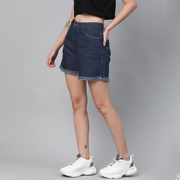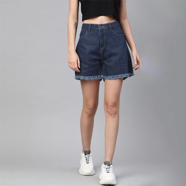Blue solid mid-rise denim shorts, has 4 pockets, button and zip closure, frayed hen