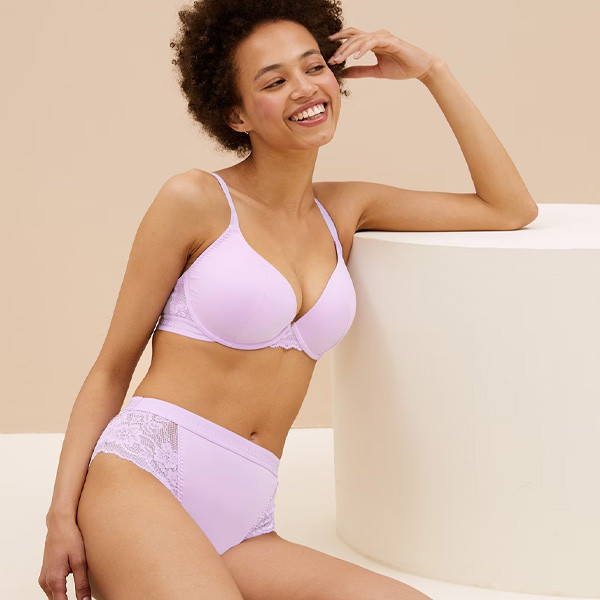 Lavender lace insert hipster briefs, has an outer elasticated waistband, double layered gusset