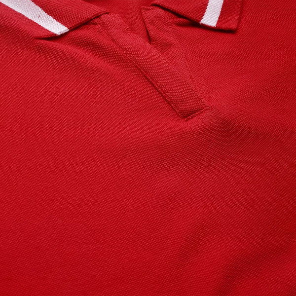 Red solid T-shirt with contrast tipping, has a polo collar, and short sleeves