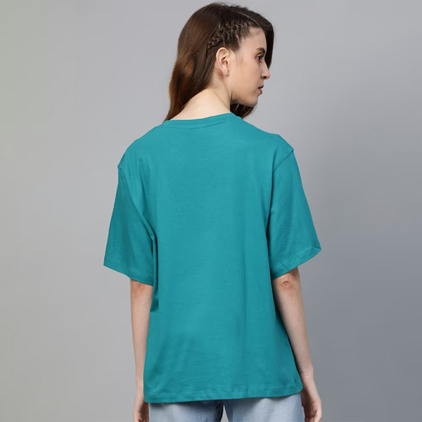 Turquoise blue solid T-shirt, has a round neck, short flared sleeves