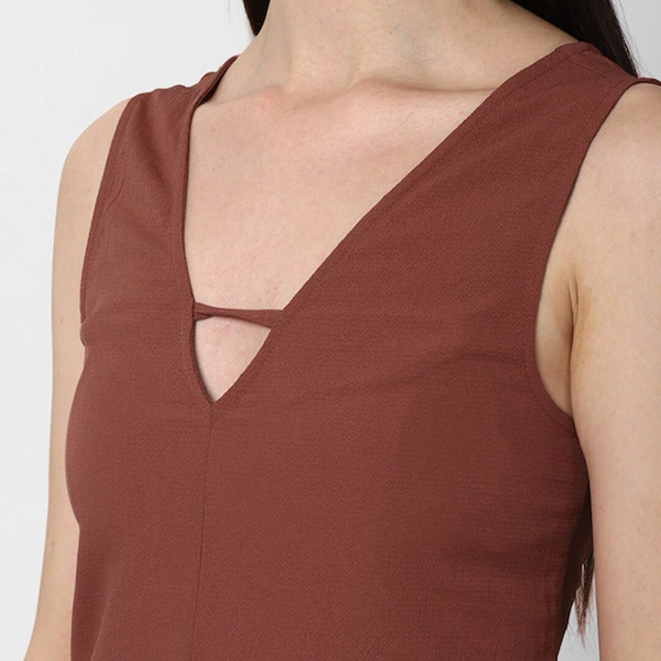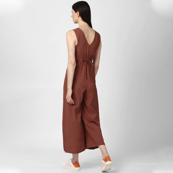 Brown solid basic jumpsuit ,has a v-neck, sleevelessSize & FitThe model (height 5'8) is wearing a size SMaterial & CarePolyesterMachine wash