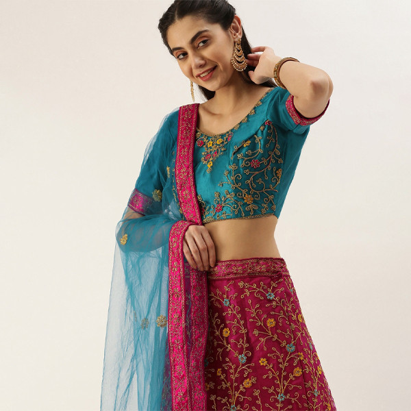 Embroidered unstitched blouse, has a round neck, short sleeves, pink and blue embroidered unstitched lehenga, flared hem