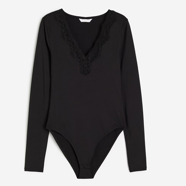 Body in soft jersey with a deep, trimmed, V-shaped opening at the front, long sleeves and concealed press-studs at the crotch.
