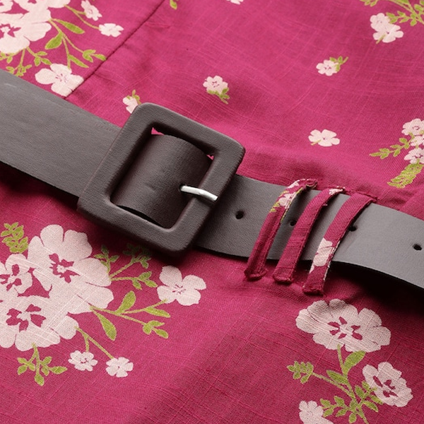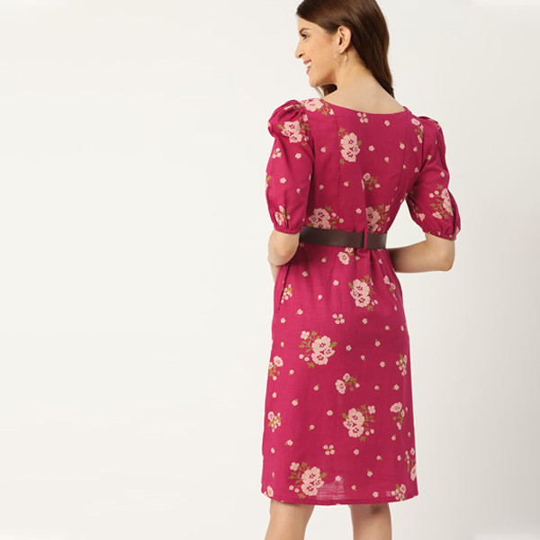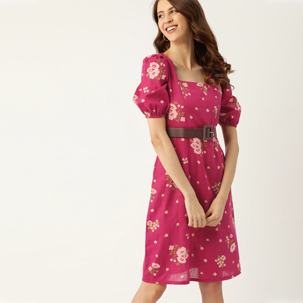 printed woven A-line dress, has a square neck, short sleeves, concealed zip closure, and straight hem