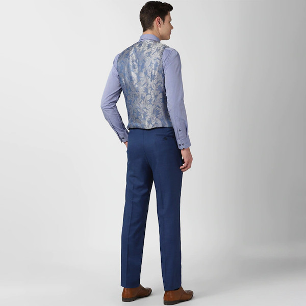 A pair of Blue self design trousers, has a waistband with belt loops, a zip fly and a button closure, and four pockets