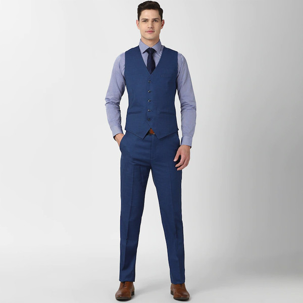 Blue self design single breasted slim-fit blazer, has notched lapel collar, long sleeves, a full button placket, two flap pockets, one welt pocket and an attached lining