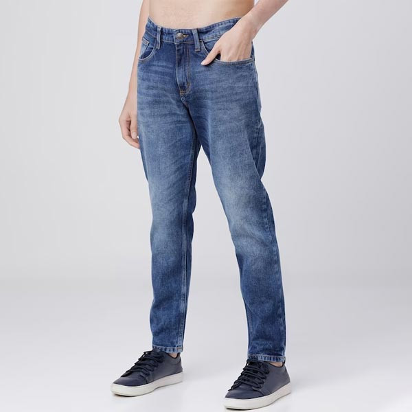 Blue medium wash jeans, clean look, heavy fade, has a button and zip closure, and waistband with belt loops Size & Fit Tapered Fit The model (height 6') is wearing a size 32 Material & Care Material: Cotton
