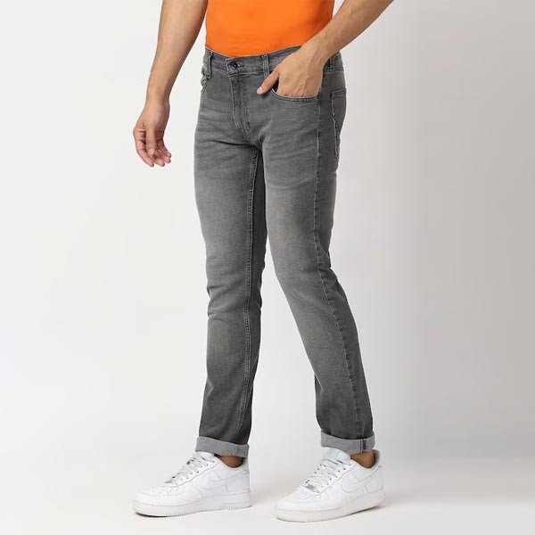 Medium shade, light fade grey jeans Slim fit, mid-rise Brand Fit: Vapour Clean look Stretchable 5 pocket Length: regular Size & Fit Brand Fit: Vapour Fit: Slim Fit Stretchable The model (height 6') is wearing a size 32 Material & Care 98% Cotton & 2% Elastane Machine Wash