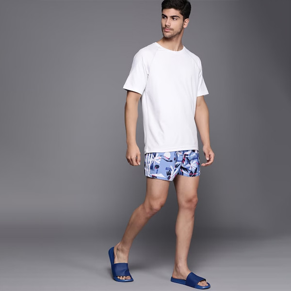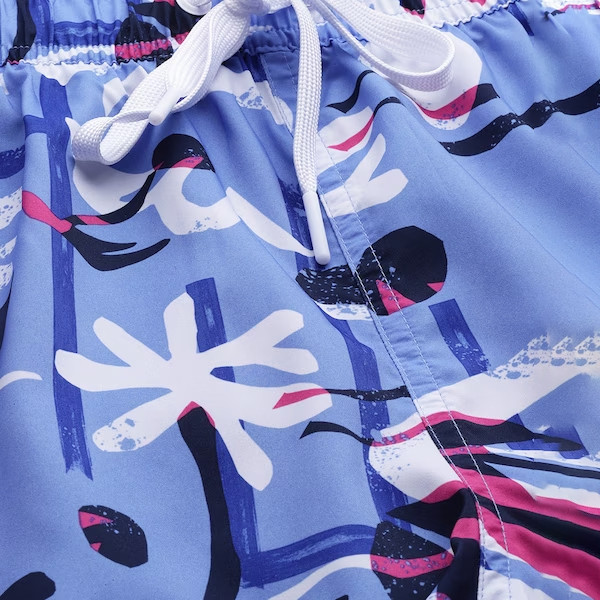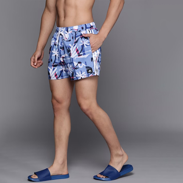 Blue and white printed swim shorts for men Above knee length Slip on closure with drawstring closure Abstract print Infused with durable, quick-drying, moisture-wicking material Size & Fit The model (height 6') is wearing a size 38 Material & Care 100% Polyester Machine Wash