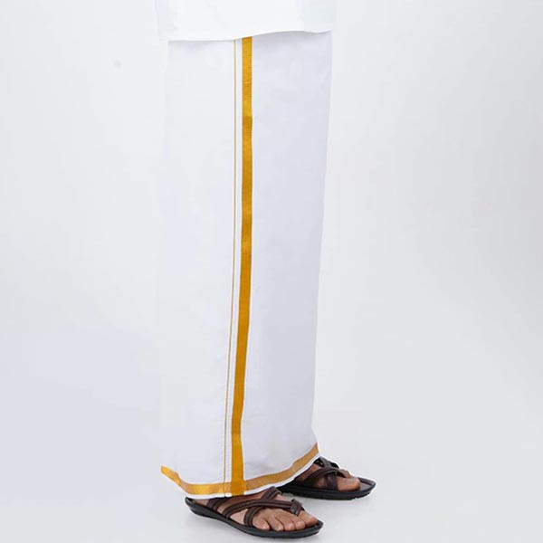 White solid political dhoti has a yellow border Size & Fit The model (height 6') is wearing a size One Size Material & Care 100% Cotton Machine Wash