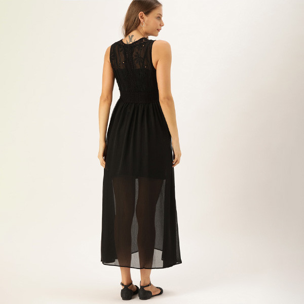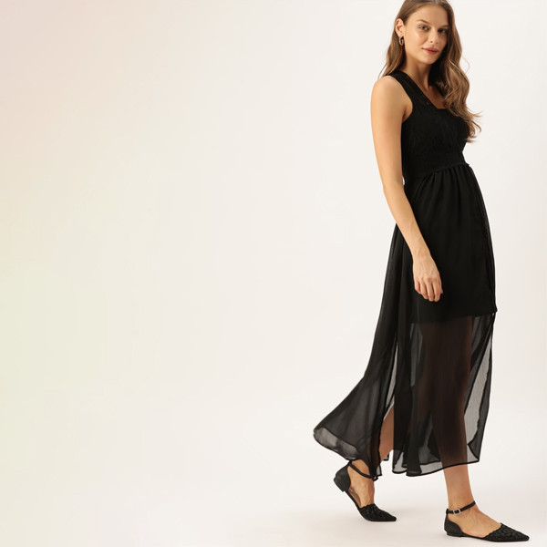 Black solid woven maxi dress, has a square neck, sleeveless, an attached lining, and straight hem