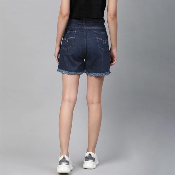 Blue solid mid-rise denim shorts, has 4 pockets, button and zip closure, frayed hen