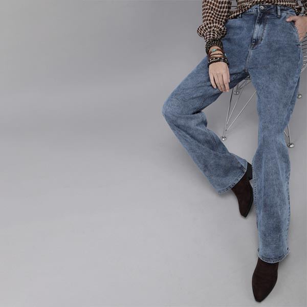 Blue medium wash 5-pocket high-rise jeans, clean look, heavy fade, has a button and zip closure, and waistband with belt loops