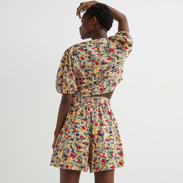 Straight-style shorts in woven fabric with diagonal side pockets and a high waist with covered elastication.