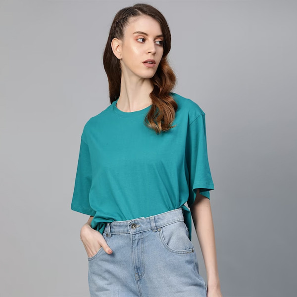 Turquoise blue solid T-shirt, has a round neck, short flared sleeves